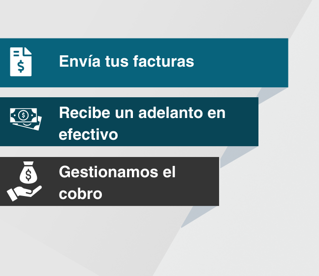 Envía tus facturas y recibe un adelanto en efectivo casi de inmediato. Nosotros nos encargamos de gestionar el cobro de las facturas, permitiéndote concentrarte en tu negocio mientras tú disfrutas de una mejora en tu flujo de caja.